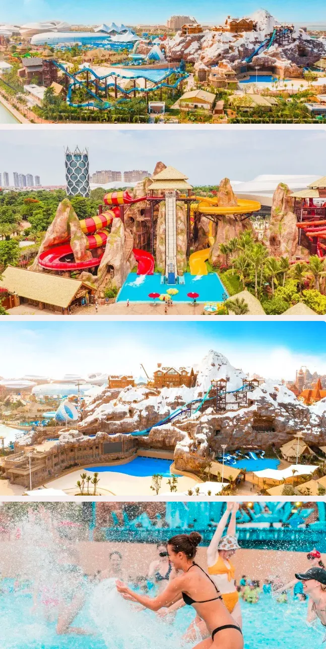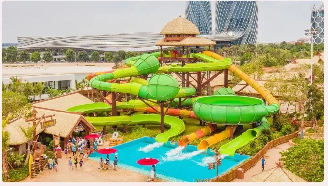 童世界水上王國位于?;◢u1號島F區南側,是海島雪山主題度假型水上樂園。共18項游樂項目,擁有6000平方米的巨型造浪池和眾多國際獲獎滑道,以及懸空、多媒體特效雪山漂流河,是全球罕有的設置了全景觀光索道纜車的水樂園,可將樂園美景盡收眼底。
