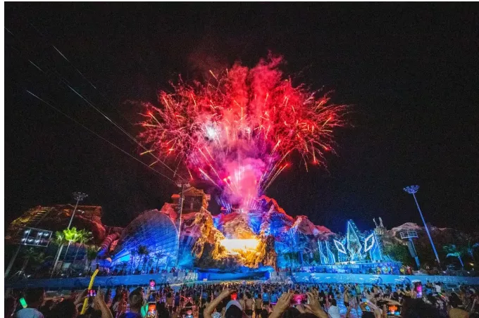 ?;◢u猶如一朵盛開的花朵在海上綻放出絢麗的色彩島上的建筑別具一格充滿了現代感,讓人流連忘返水上王國18大項目驚險刺激,童趣滿滿雪山秀以光影與煙花聯動打造全新雪山盛宴