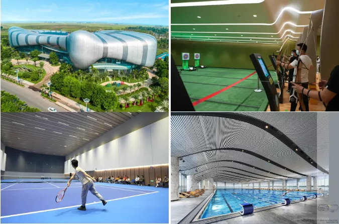 運動健身中心:集休閑、競技及培訓于一體,內設游泳館、籃球館、網球館、健身房、淘氣堡館、射箭館等八大運動功能區。